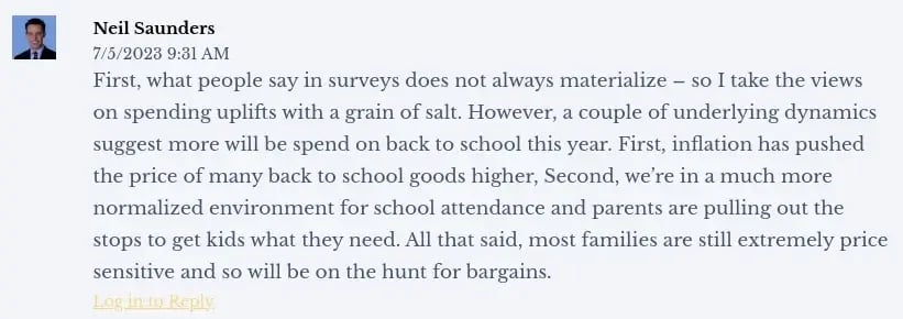 Back-to-school 2023. What are your expectations for back-to-school selling and the role inflation will play in the season? Do you see 2023 BTS being any more or less price driven versus 2022 selling? Several retail experts answered these questions in one of Retail Wire’s discussions. This is what Neil Saunders mentioned: